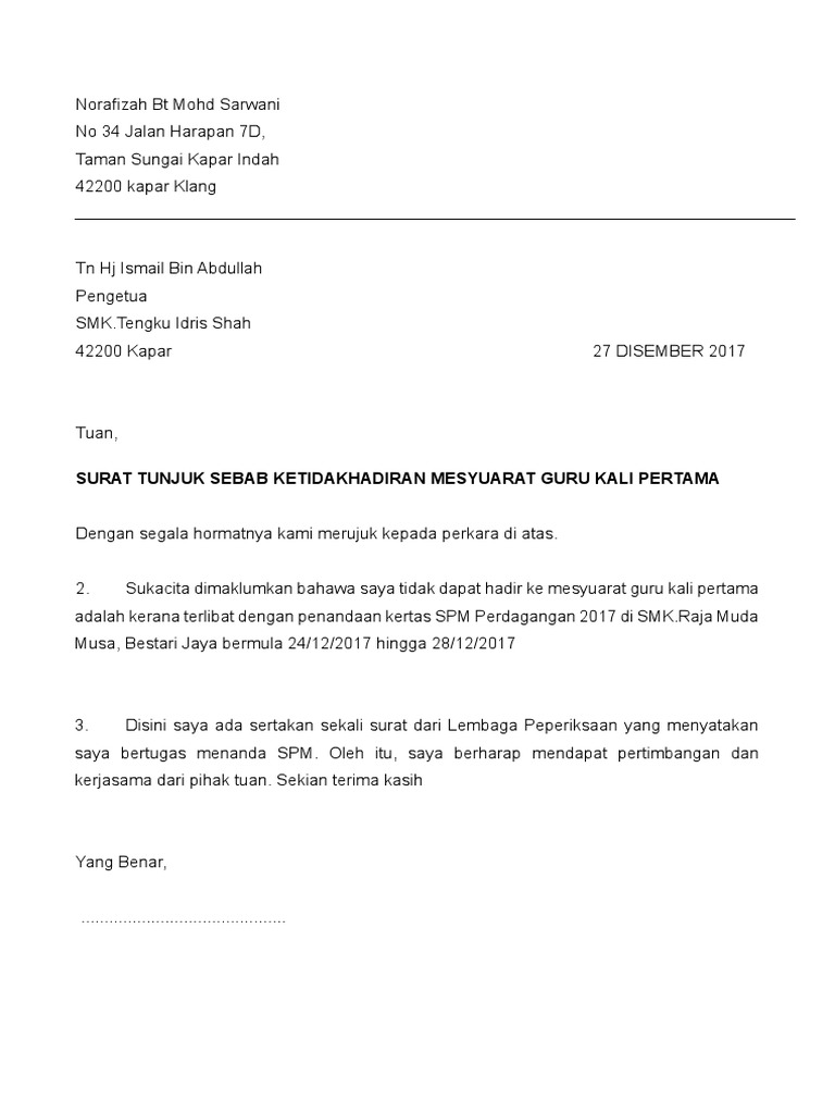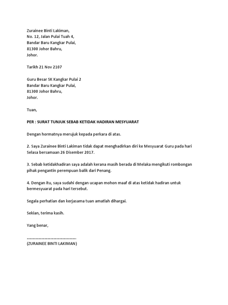 Contoh surat rasmi tidak hadir ke sekolah kerana balik via ndangkerjo.blogspot.com. Walaupun cuma tidak datang ke mesyuarat, pastikan anda menulis alasan yang. Puan, surat tunjuk sebab ketidak hadiran mesyuarat dengan hormatnya merujuk kepada perkara di atas. Contoh surat x hadir kelas via www.scribd.com. Dengan hormatnya merujuk kepada perkara di atas. Saya muhammad zulhilmi bin azman bernombor matriks ad170310 tidak menghadirkan diri ke kelas pada 5. Ianya perlulah ditulis dengan bahasa mudah difahami dan terus kepada isi. Sebab ketidakhadiran saya adalah kerana demam dan sakit kepala. Saya mohd munzir mustafa tidak dapat menghadirkan diri ke kursus teach smart yang berlangsung di bilik mesyuarat pada hari. Nurul izzah tunjuk bukti surat spr maklum. Sebab ketidakhadiran saya pada hari. Surat tunjuk sebab ketidak hadiran mesyuarat. Saya mohammad izzuddin bin saifulqahar no.
